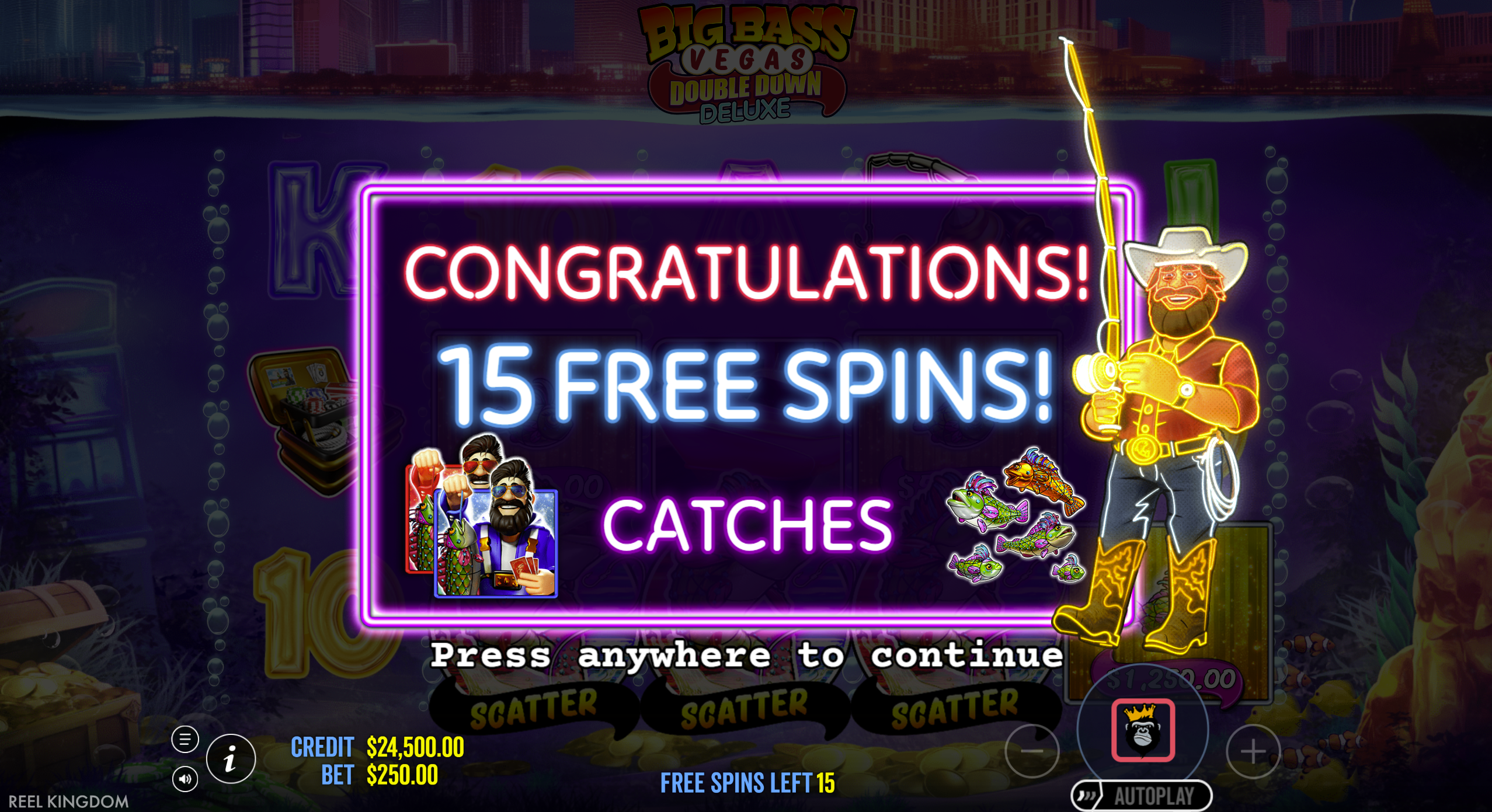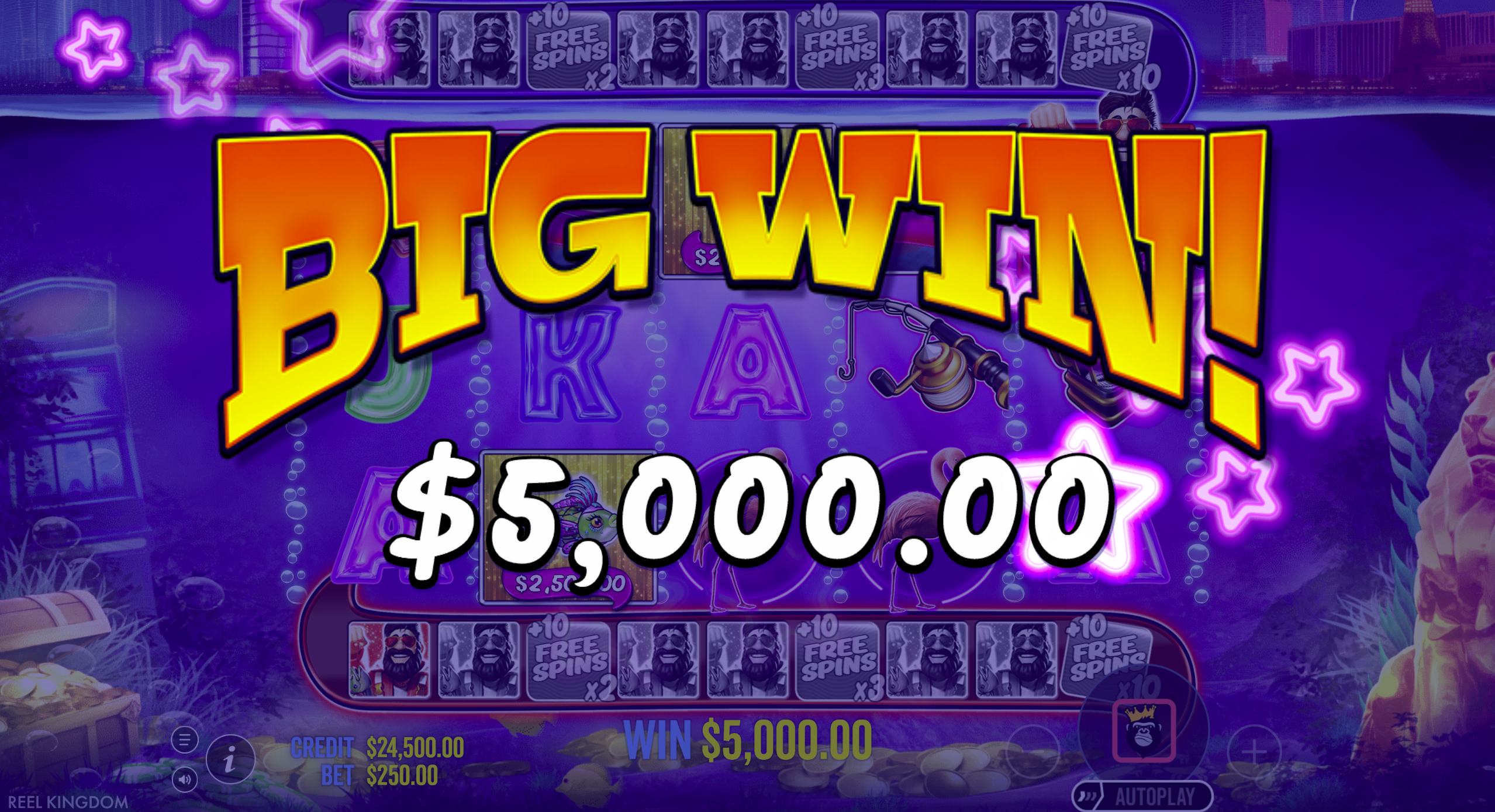 • Money Symbols (Fish with cash values): These can appear during both base game and free spins. In the bonus round, if a fisherman wild lands, it collects visible money values for cash prizes. :contentReference[oaicite:11]{index=11}