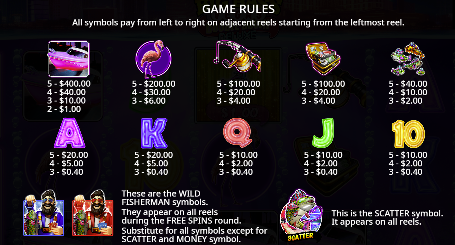 • Wild Symbol Fisherman: This symbol substitutes for other symbols (except scatter) to help complete wins. During Free Spins, the fisherman has an additional role of collecting money-symbol values currently on the reels. :contentReference[oaicite:9]{index=9}